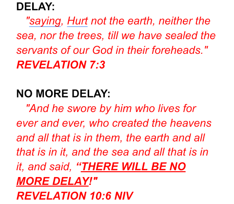 Now that we understand Jesus (Mark 13:35) is speaking specifically about the”half-hour” of silence (Revelation 8:1), these are the obvious reasons for “no more delay!” Thank you and God bless you.
