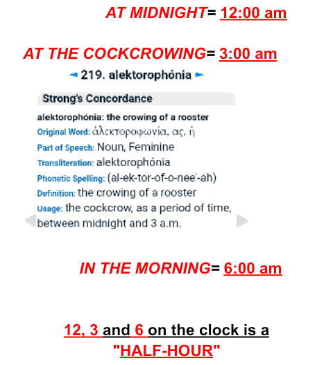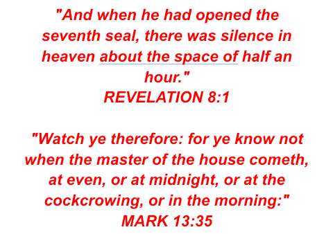 This post is an effort to explain that Jesus is specifically speaking of the final “half-hour” of silence (Revelation 8:1) before the “7 Trumpets” in Mark 13:35. First let us look at what He is describing: